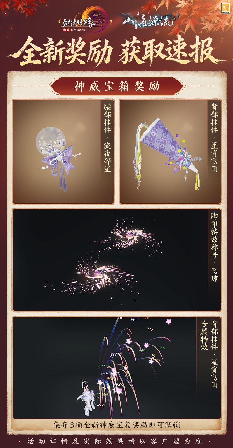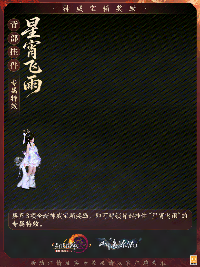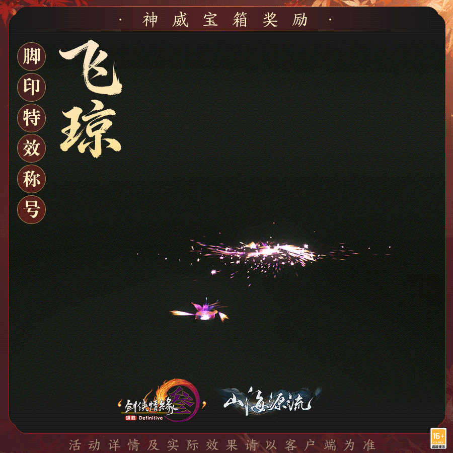 全新拭剑宝箱融星月璀璨,气质卓然,集齐三件套还可解锁专属白发奖励!与此同时,神威宝箱奖励脚印特效称号“飞琼”踩碎烟火似踏星而行,夜绽华满树,金枝溢流琼。背部挂件“星宵飞雨”的专属特效以彩色绸纸作彩焰,萌趣十足!