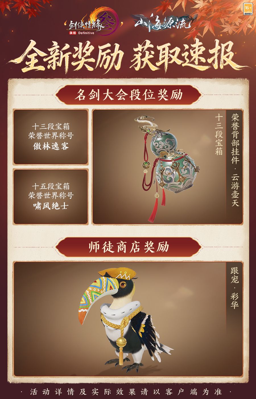 单骑大漠逐风沙,胸存壮志撼云霞,诸多玩法奖励今日登场!名剑大会专属段位荣誉称号与背部挂件奖励尽显傲气锋芒,师徒商店迎来新成员——跟宠“彩华”!