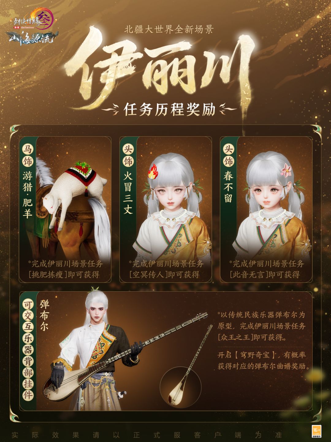 全新外装奖励“牧原胡装”为伊丽川牧民日常起居所着服饰,以皮毛点缀裙裾,颇具塞外风情,尽显草原儿女自由豪迈、热情奔放之态!