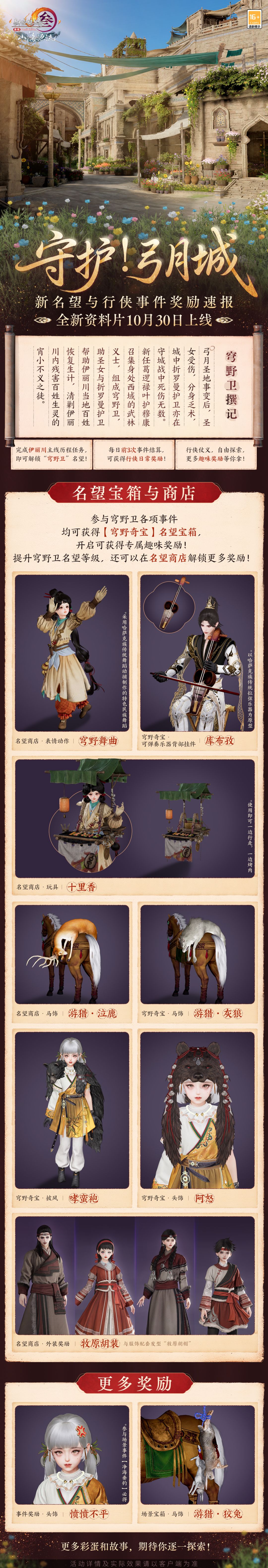 守护弓月城,守护伊丽川的明珠!完成伊丽川主线历程任务后,即可解锁“穹野卫”名望,从而获得可弹奏乐器背部挂件【库布孜】等奖励!这些奖励凝练着北疆浓厚的民族风情,续写了塞外独特的文化密码,更将这片土地厚重的历史文脉尽数彰显。