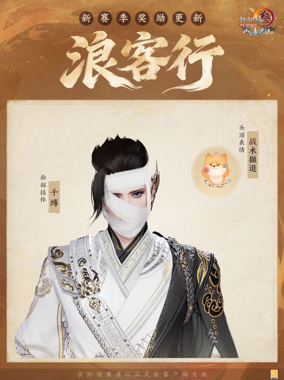全新浪客行玩法奖励头顶表情“战术撤退”同步登场,另有面部挂件“千缚”以布条覆面,缠千匝过往,缚一隅清明。