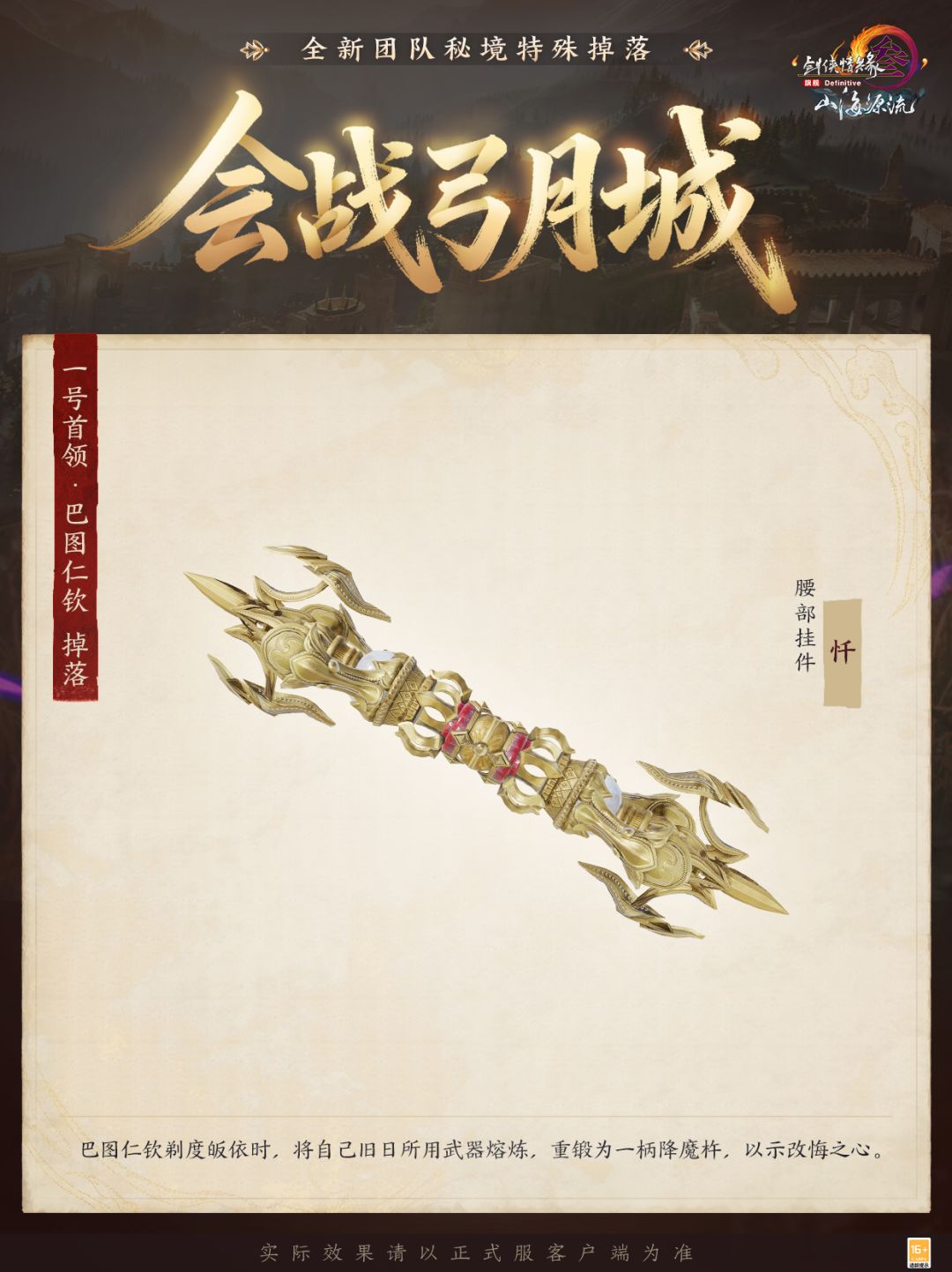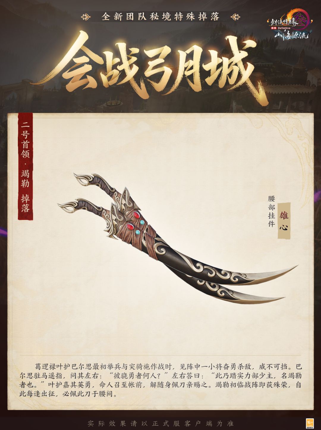 双英剑破千般相,一念心开万法明,弓月城扼守天山北麓要道,在圣女的庇护下超然于部落纷争。然而,图谋霸业的铁骑正暗中谋划破坏这一隅安宁!全新团队秘境“会战弓月城”满足全民PVE要求,不同难度模式即将陆续开放!