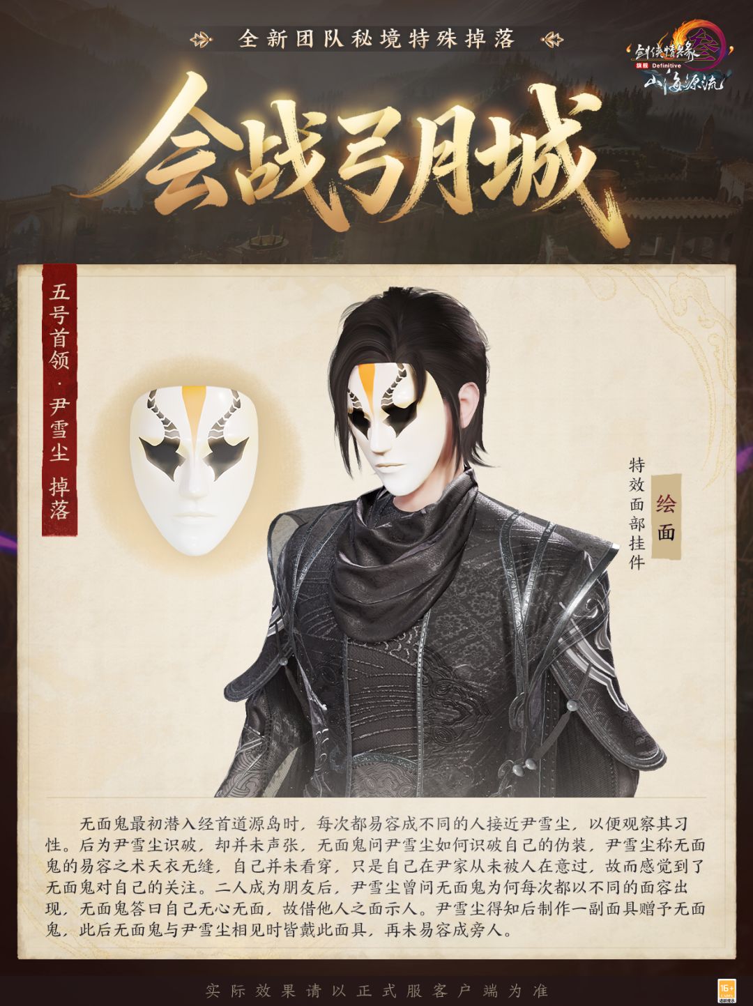 成功挑战“会战弓月城”首领将有机会获得特殊掉落奖励,马具“披风快意”颇具特色,特效面部挂件“绘面”彰显神秘诡谲,使用还能化身成为“无面鬼”!