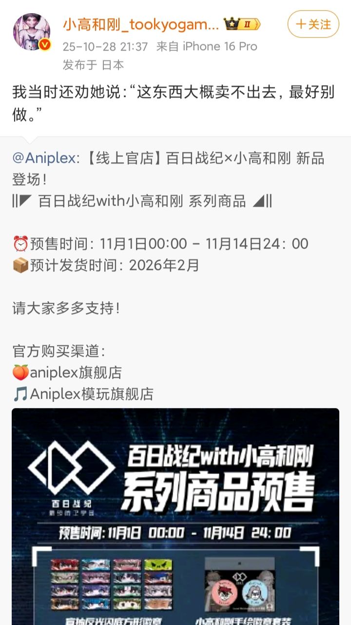 10/28号,Aniplex官方宣布将推出“百日战纪with小高和刚”全新系列周边,但其本人并不看好:“我当时还劝她说,这东西大概卖不出去,最好别做”😂😂😂