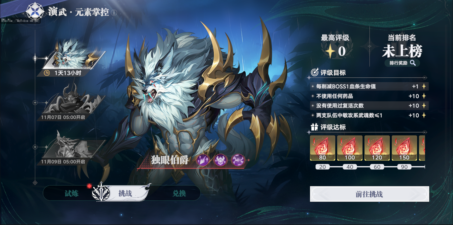 ➢ 元素挑战:达到对应评级可以获得元素结晶,同时每个BOSS会根据评级排行发放对应奖励邮件,奖励包括武魂觉醒券、限定武魂觉醒券、古遗神念玉、启灵通天玉、启灵破天玉、元素结晶和武魂强化材料等;