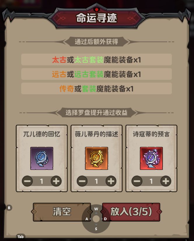 进入魔能秘阁前,探险家可以在【命运寻迹】中放入【命运罗盘】,使得通关后额外获得特定品质的魔能装备。