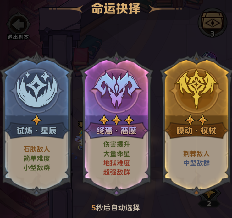 每轮怪潮结束后,进入命运抉择阶段,随机出现三张【命运之牌】,分别对应不同的怪物难度和增益效果,探险家可以在其中任选一张。命运之牌携带【命星】,积累对应的命星数量,可获得额外的命星奖励掉落。