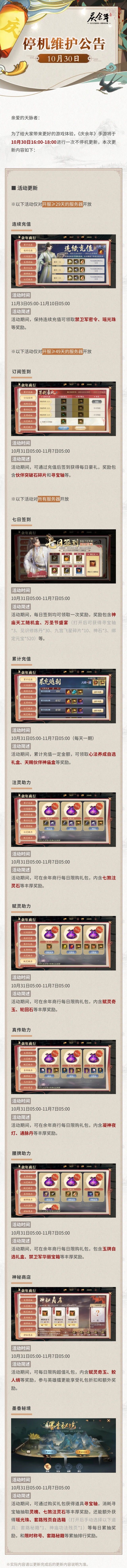 为了给大家带来更好的游戏体验,《庆余年》手游将于10月30日16:00-18:00进行一次不停机更新,本次更新内容如下: