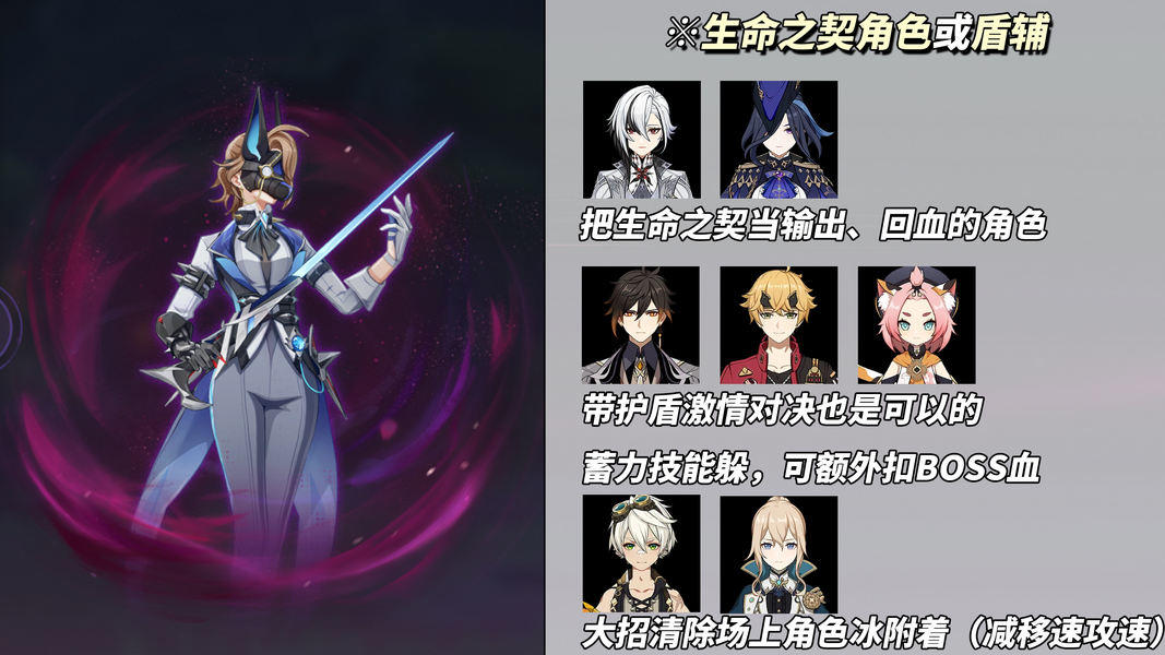 推荐配队顺序,1->3->2,一般都是第1关卡次数盾或第3关被生命之契与高频挂冰挡住,较少见到卡第2关的情况。上述配队推荐仅是小部分,更多要点在BOSS解析中,看懂机制再从自身已有角色里挑选。