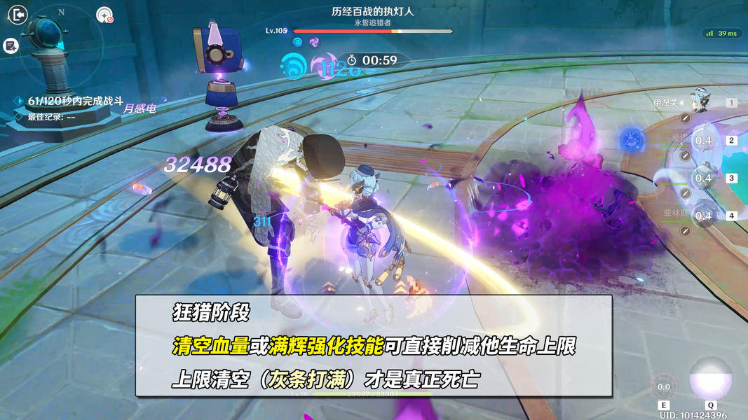 ②阶段二「狂猎」状态,通过再次清空血量或施放满辉强化技能,才可削减他的生命上限(满辉效率更高),上限清0才会真正死亡。