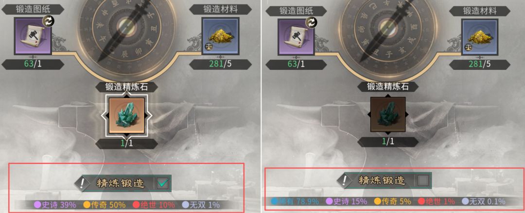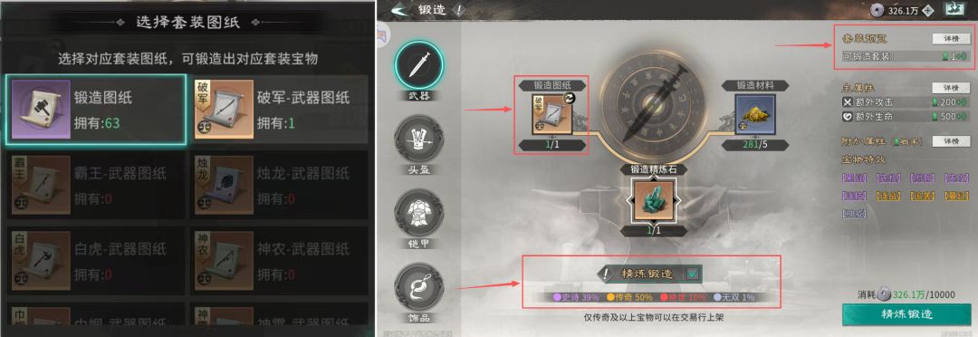 特殊的指定图纸可以锻造出对应套装的宝物,而普通图纸锻造的宝物则是随机套装。此过程中同样可以通过选择“精炼锻造”来提高出宝率。