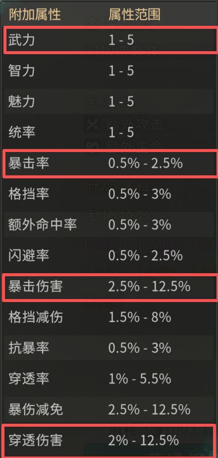 宝物的附加属性优先推荐武力,其次暴击、暴击伤害,穿透伤害。附加属性比较随机,不要刻意去追求。优先挑选能用的宝物特效即可。