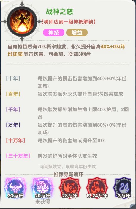 ● 神·戴沐白-第二神技【战神之怒】:自身格挡后有70%概率触发,永久提升自身40%暴击伤害,可叠加,冷却3回合