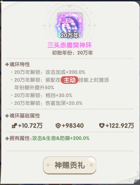 ● 参与神域试炼活动可获得神明愿力、法则本源与二十万年三头赤魔獒神环、二十万年妖眼魔树神环等奖励