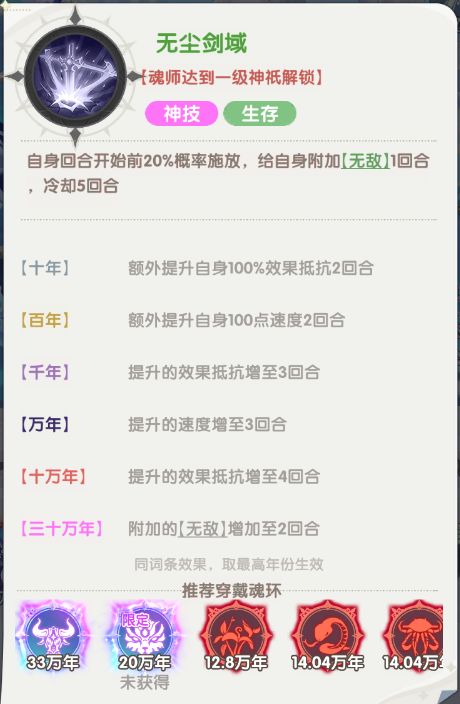 ● 神·尘心-第二神技【无尘剑域】:自身回合开始前20%概率施放,给自身附加【无敌】1回合,冷却5回合
