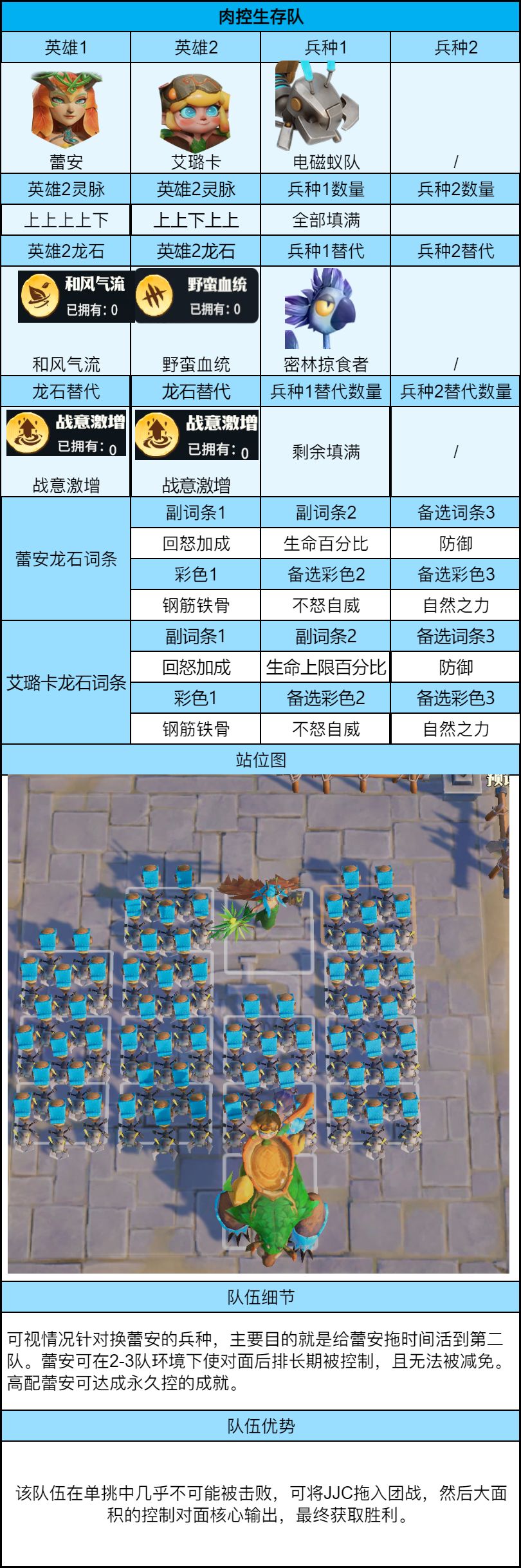 当前最强思路为,1队使用绝对控制队(蕾安)拖时间进场,使整个场面形成团战局面;接下来用召唤人海流搅乱对面的输出空间,让蕾安获得大量空间一直控制对面核心输出,而己方核心输出在保护良好的情况下大量输出。