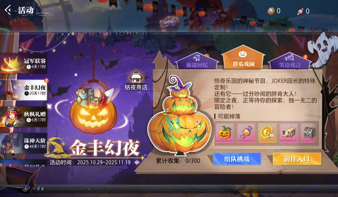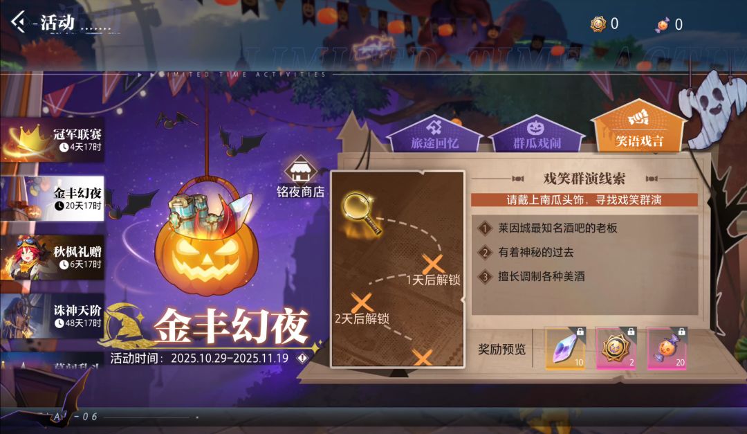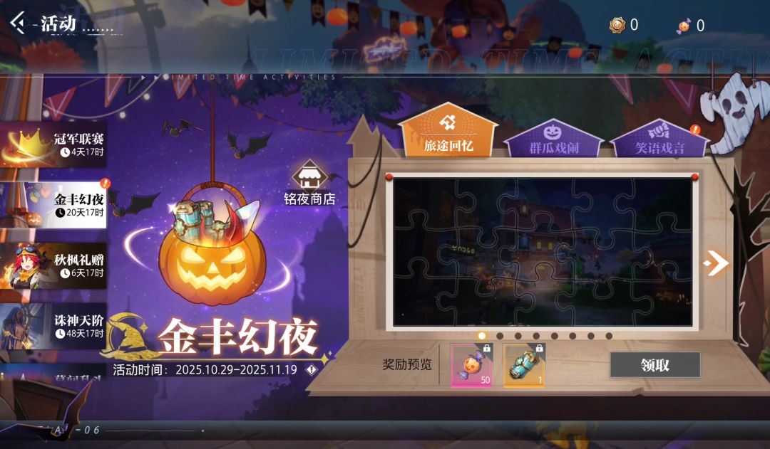 金丰幻夜系列活动现已上线,即日起至11月19日6:00,完成「旅途回忆」、「群瓜戏闹」、「笑语戏言」、「南瓜寻宝」等任务即可获得铭夜软糖,前往「铭夜商店」可兑换专属头饰、专属头像、3级异构铭刻随机箱等奖励。