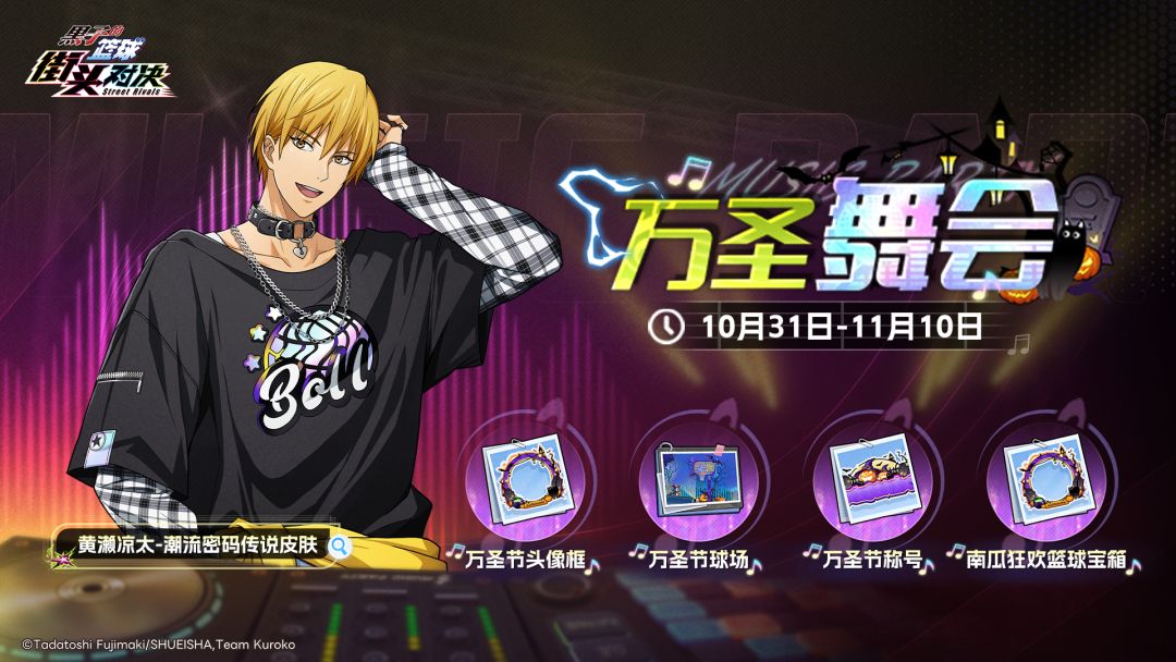 万圣舞会活动即将上线!登录、消耗点券、做任务都能获得丰厚奖励,更有多重抽奖玩法等你参与,传说皮肤「黄濑凉太-潮流密码」和「万圣节球场」等你拿!