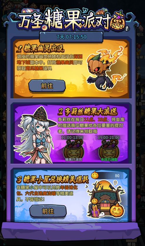 2)多莉丝会在每日11-13点,19-21点准时免费放送[南瓜糖果]道具,获得的[南瓜糖果]可在[糖果小屋]内兑换道具