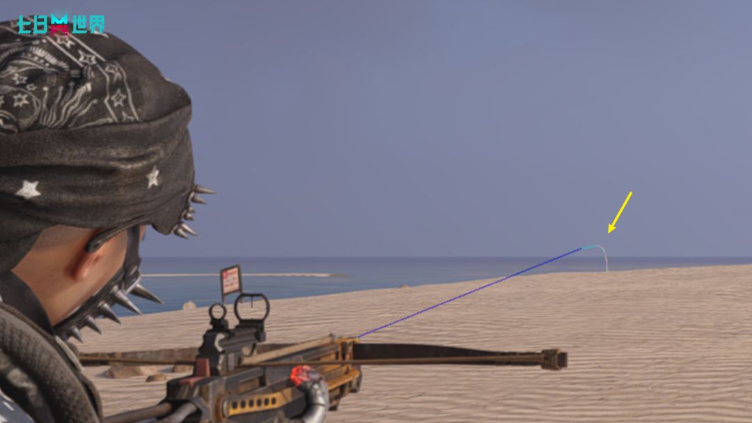 2)在超过第一段的距离后,子弹会维持投射物形式的机制,存在飞行时间和下坠。远距离命中依然较难,但相比之前实际子弹下坠会略低(如下图中绿色下坠线条所示)。
