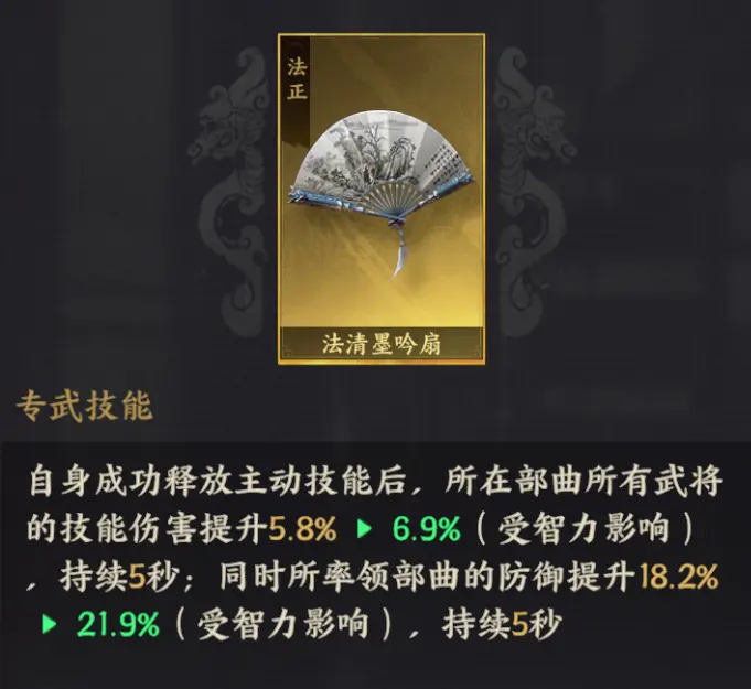 ●法正的专武【法清墨吟扇】在释放技能后提升全队武将技能伤害,为诸葛亮的爆发提供更强大的支持。这套配合使得"斗智弓"在面对智力较低的队伍时,能打出更高额的爆发伤害。