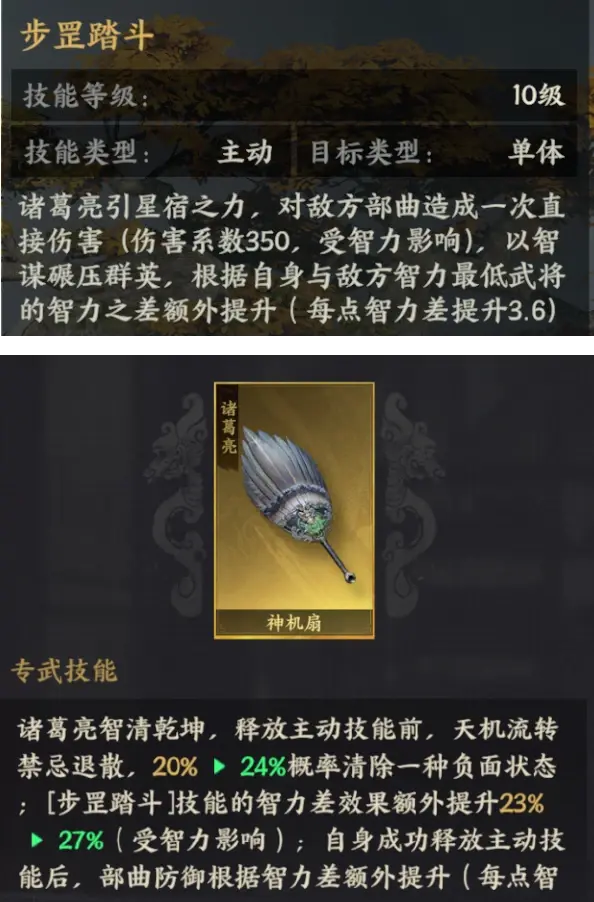 ●诸葛亮的主动技能【步罡踏斗】根据自身与敌方智力最低武将的智力差额外提升伤害,其专武【神机扇】更将这一效果大幅提升,使得智力差距直接转化为毁灭性打击。