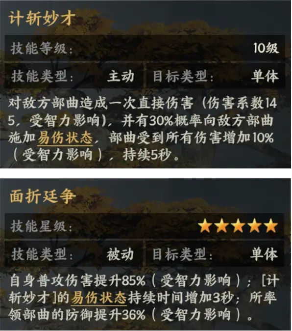 ●法正的主动技能【计斩妙才】可对敌方施加易伤状态,兵书【面折廷争】延长易伤持续时间,让敌方承受更多伤害。