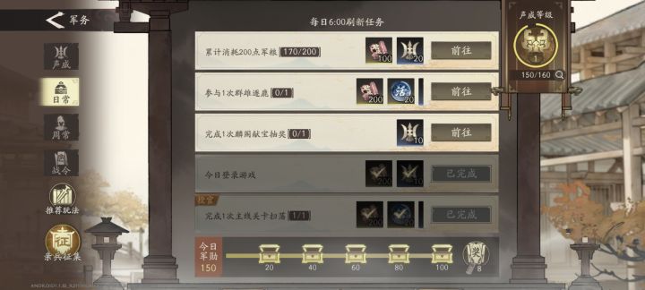 昨天声威值就150,今天还是,卡在1级150,升不了2级。今天领取了日常任务箱子,声威值也不加