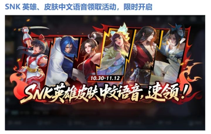近日,《王者荣耀》官方宣布将在10月30日更新的KPL总决赛版本中,推出备受期待的SNK英雄限时返场活动,玩家通过参与“免费领时装”任务,即可兑换SNK英雄自选宝箱,内含娜可露露、不知火舞、橘右京三位高人气角色,与此同时,游戏首次为SNK系列英雄及皮肤补全了中文语音包,解决了长期因版权问题缺失中文配音的遗憾,没有snk英雄的朋友们不要错过咯![[TapTap表情|TapFamilyxdoro2_粉狗比心]](https://img-tc.tapimg.com/market/images/101c7e3200596fe8e03765080b467fb8.gif)