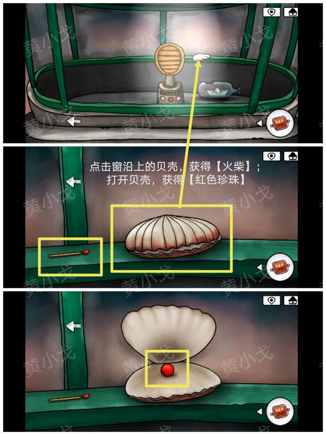 28.点击窗沿上的贝壳,获得【火柴】;打开贝壳,获得【红色珍珠】