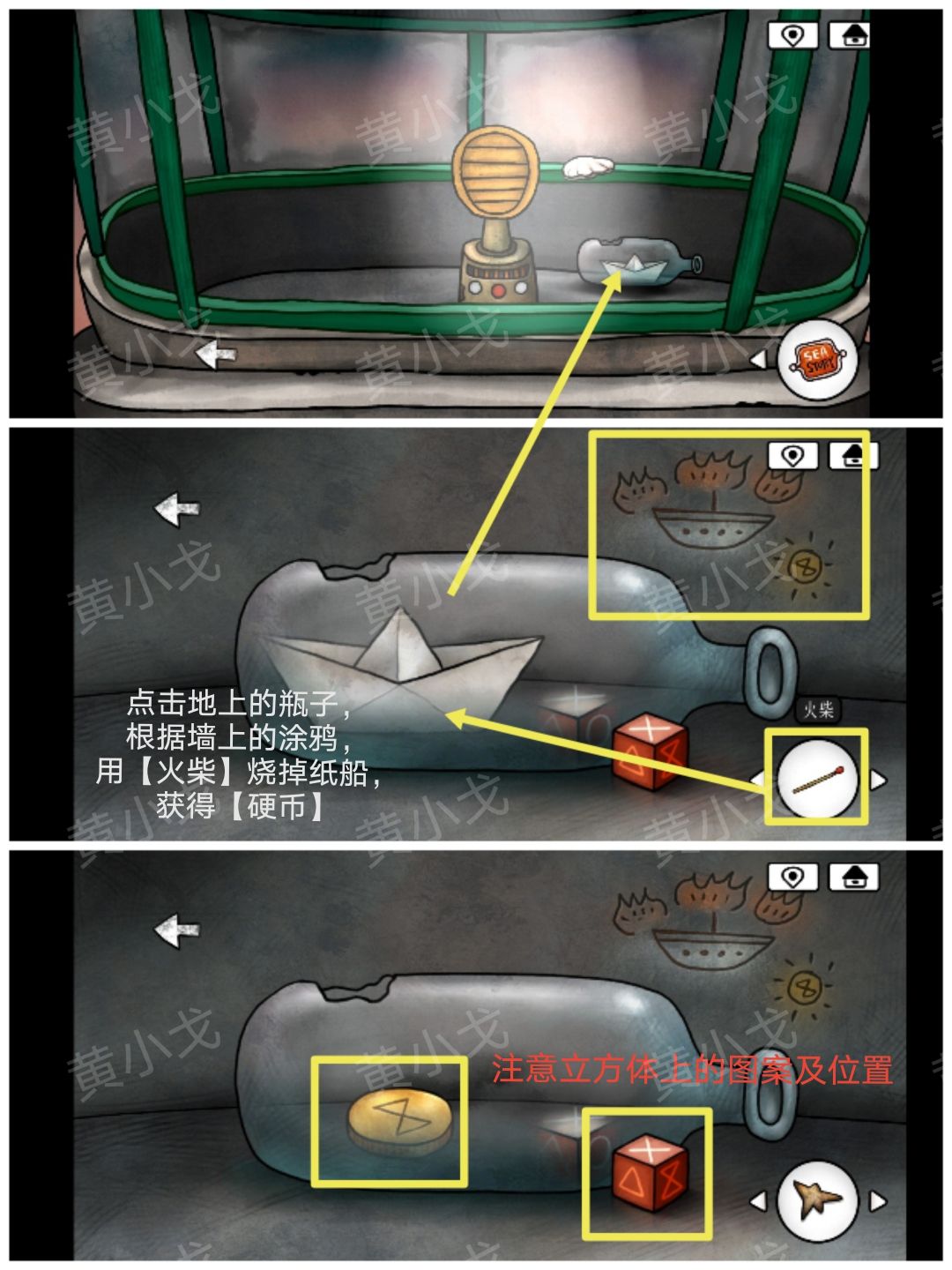 29.点击地上的瓶子,根据墙上的涂鸦,用【火柴】烧掉纸船,获得【硬币】
