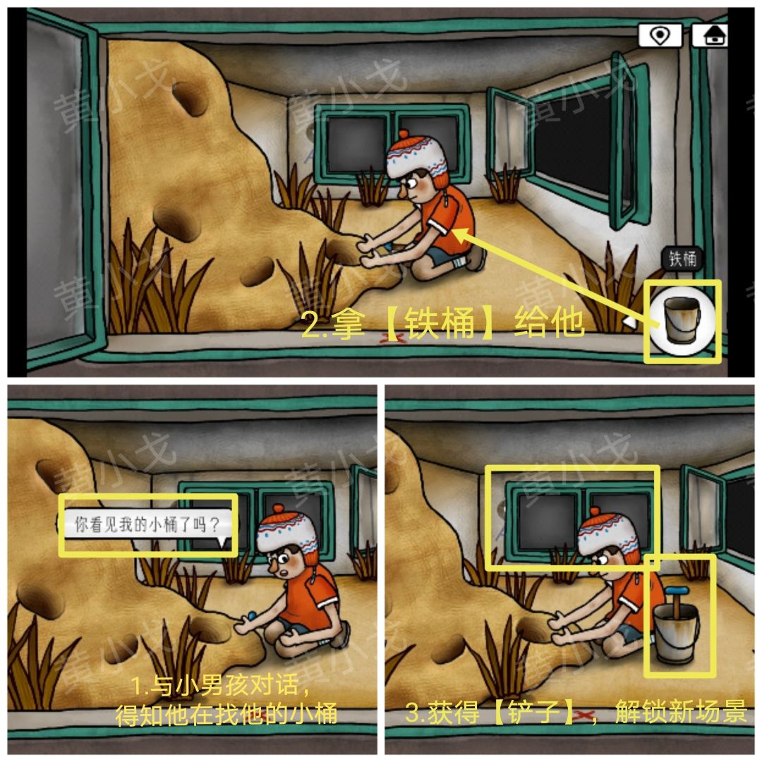 15.与小男孩对话,得知他在找他的小桶;拿【铁桶】给他,获得【铲子】,解锁新场景