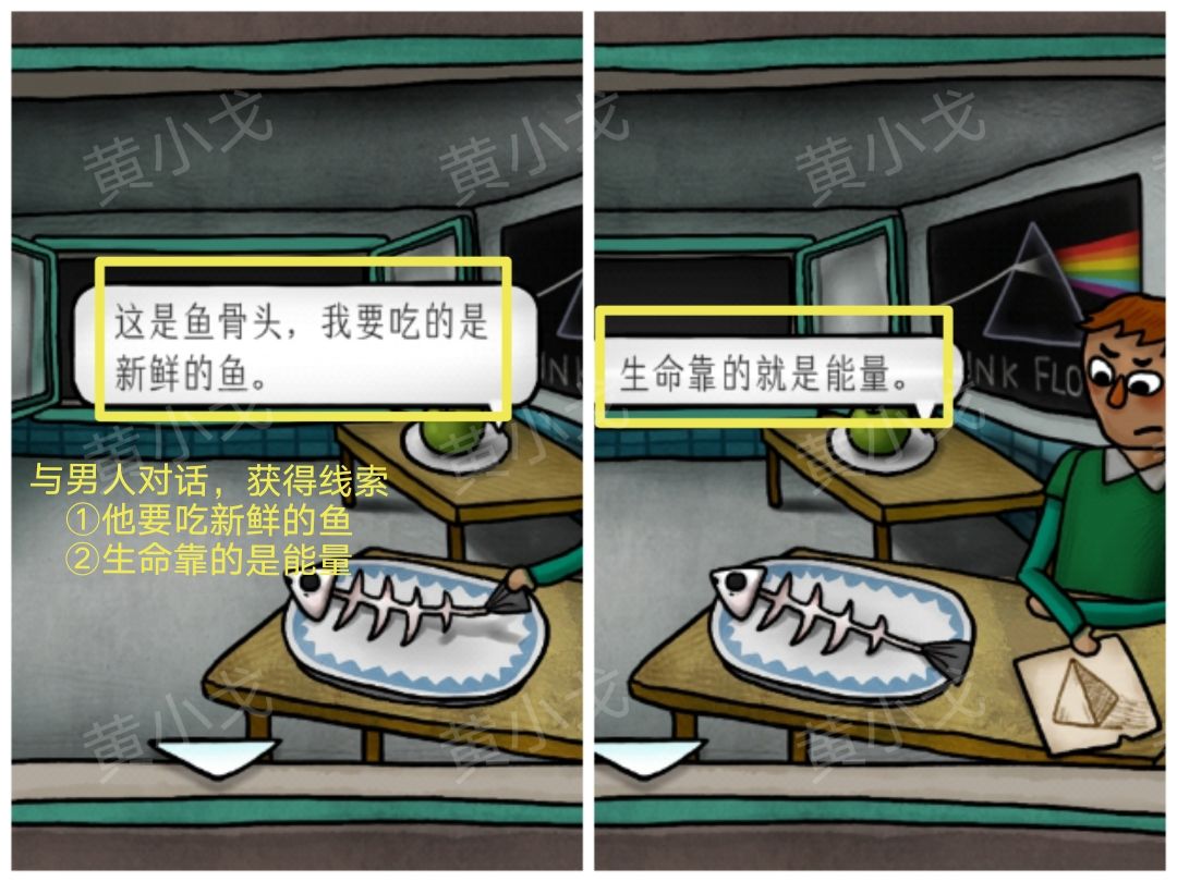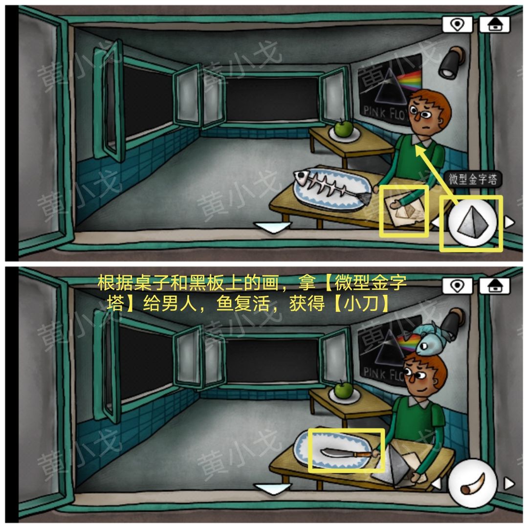 35.根据桌子和黑板上的画,拿【微型金字塔】给男人,鱼复活,获得【小刀】