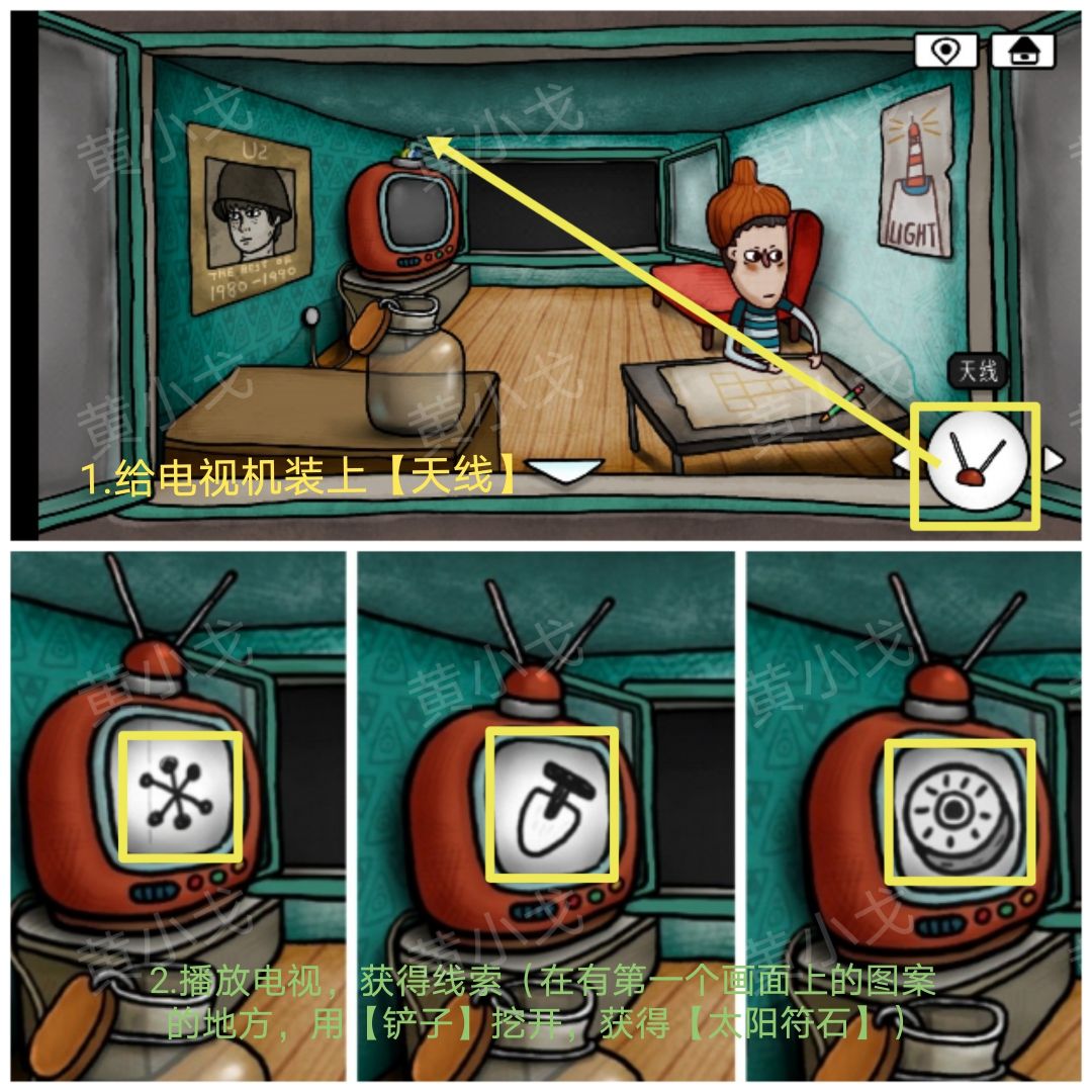 9.给电视机装上【天线】;播放电视,获得线索(在有第一个画面上的图案的地方,用【铲子】挖开,获得【太阳符石】)