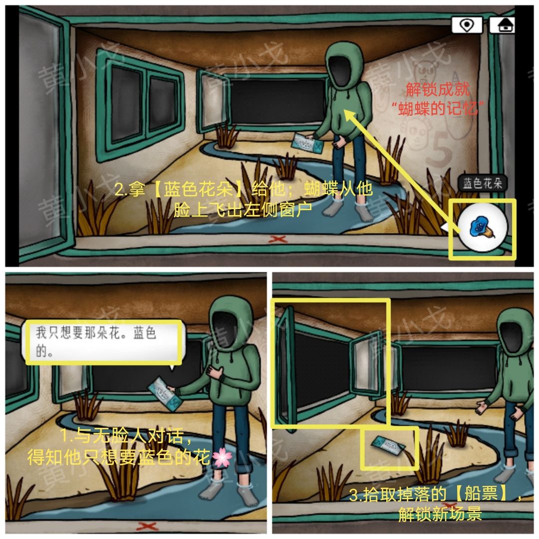 14.与无脸人对话,得知他只想要蓝色的花;拿【蓝色花朵】给无脸人,蝴蝶从他脸上飞出左侧窗户,解锁新场景;拾取掉落的【船票】