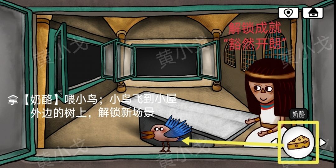 20.拿【奶酪】喂鸟,小鸟飞到小屋外边的树上,解锁新场景