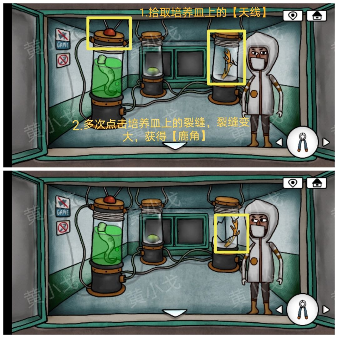 7.拾取培养皿上的【天线】;多次点击有裂缝的培养皿,裂缝变大,获得【鹿角】