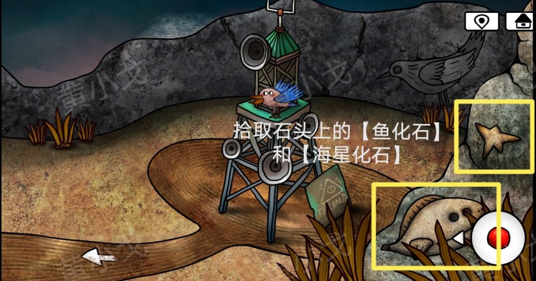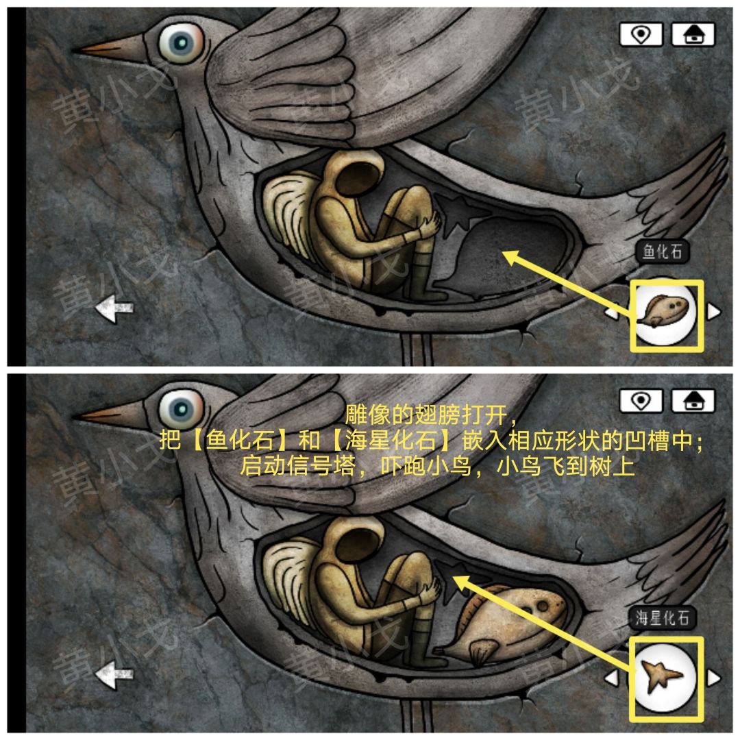 25.雕像的翅膀打开,把【鱼化石】和【海星化石】嵌入相应形状的凹槽中;启动信号塔,吓跑小鸟,小鸟飞到树上