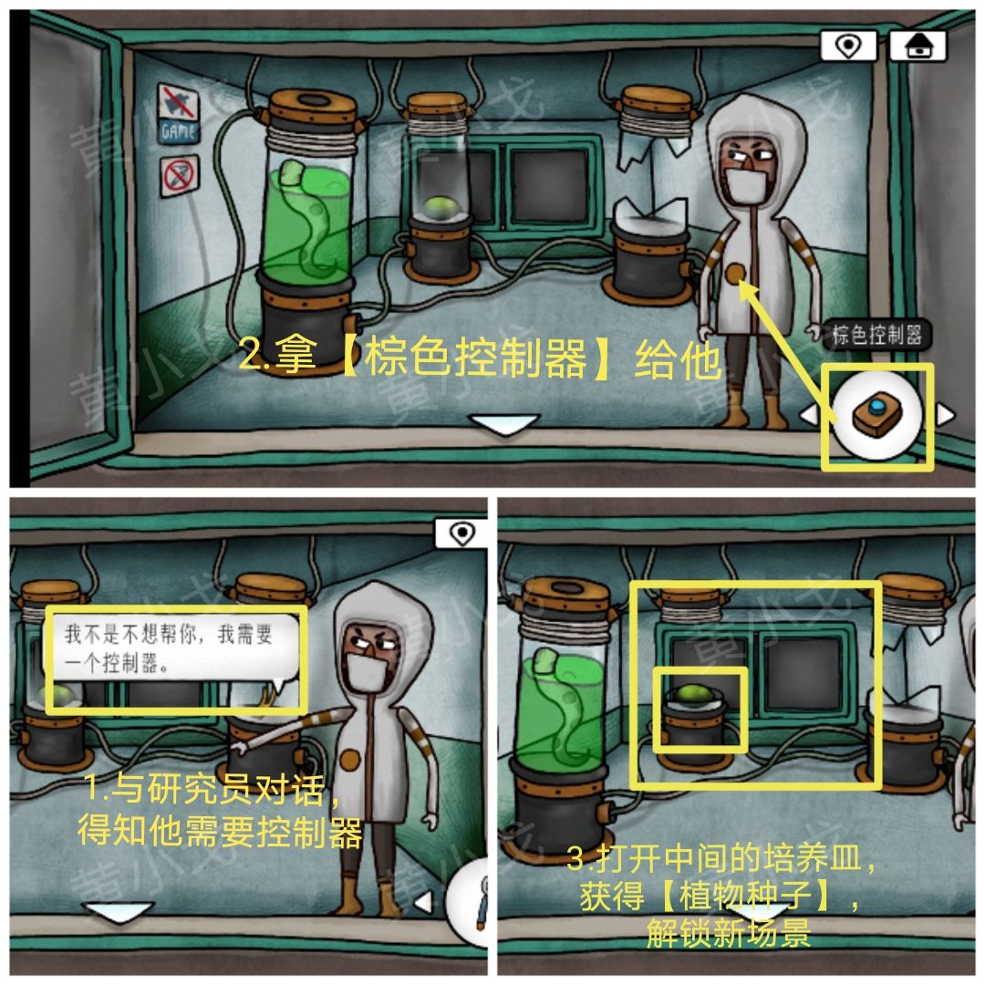 1.与研究员对话,得知他需要控制器;拿【棕色控制器】给他;打开培养皿,获得【植物种子】,解锁新场景