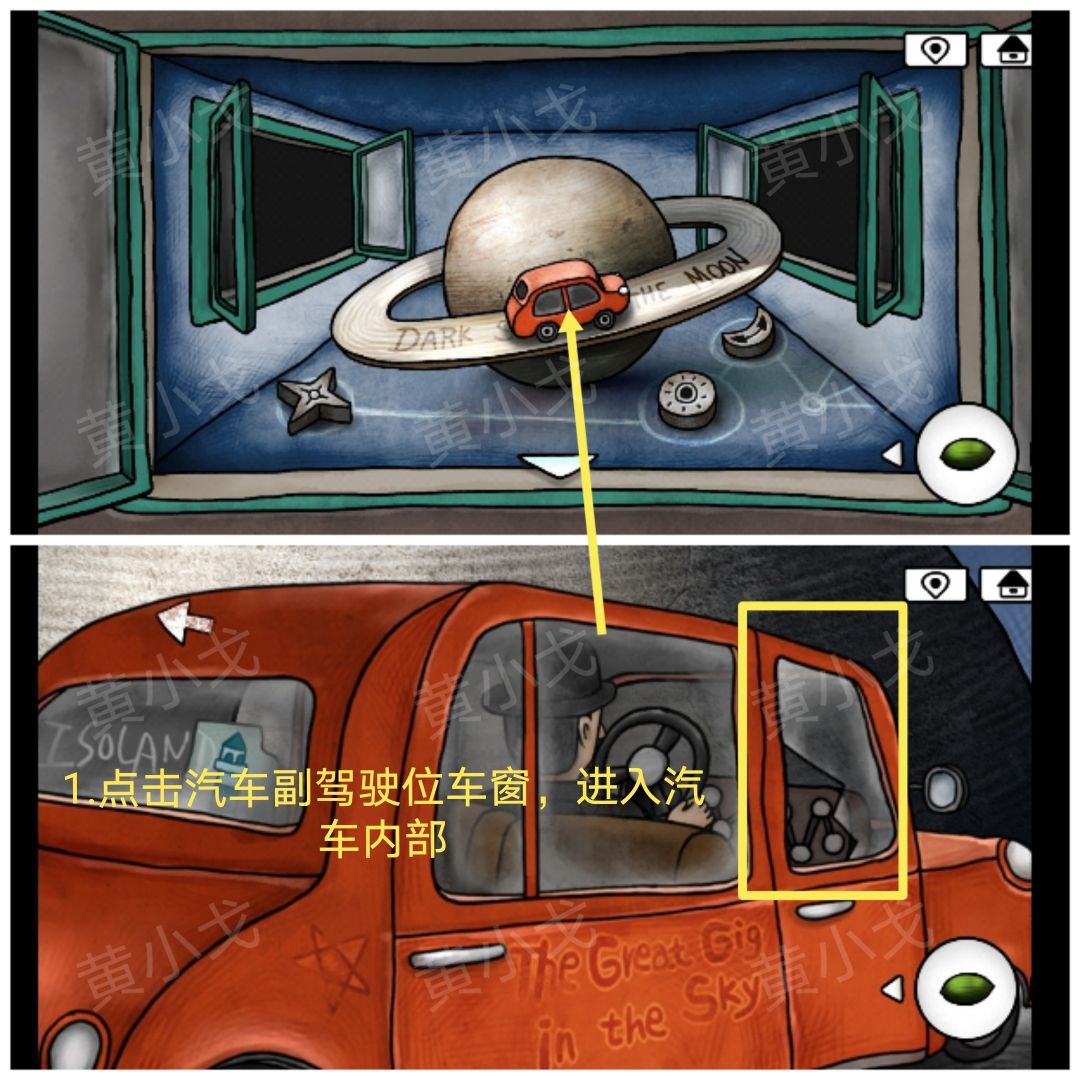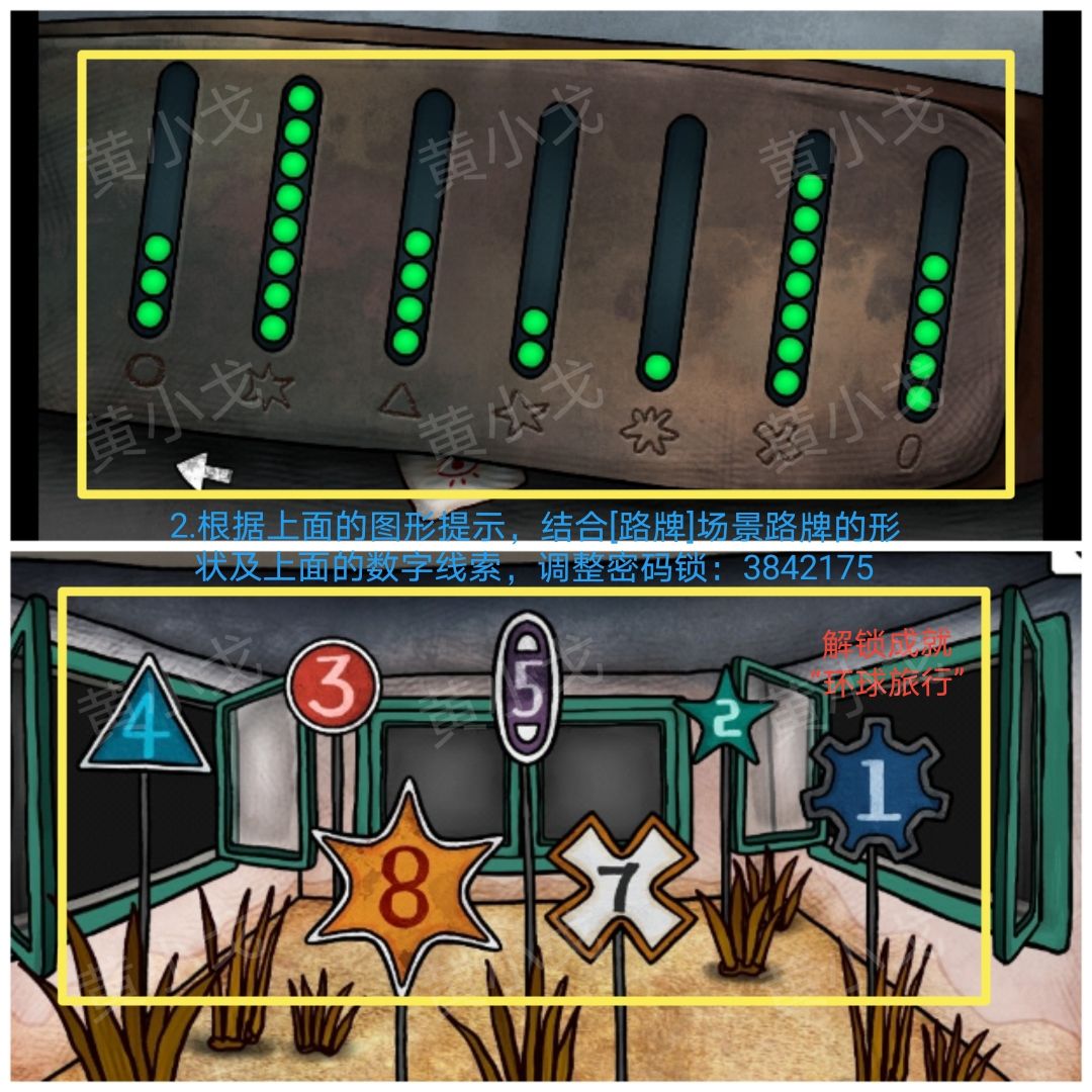 12.点击汽车副驾驶位车窗,进入汽车内部,根据上面的图形提示,结合[路牌]场景路牌的形状及上面的数字线索,调整密码锁:3842175