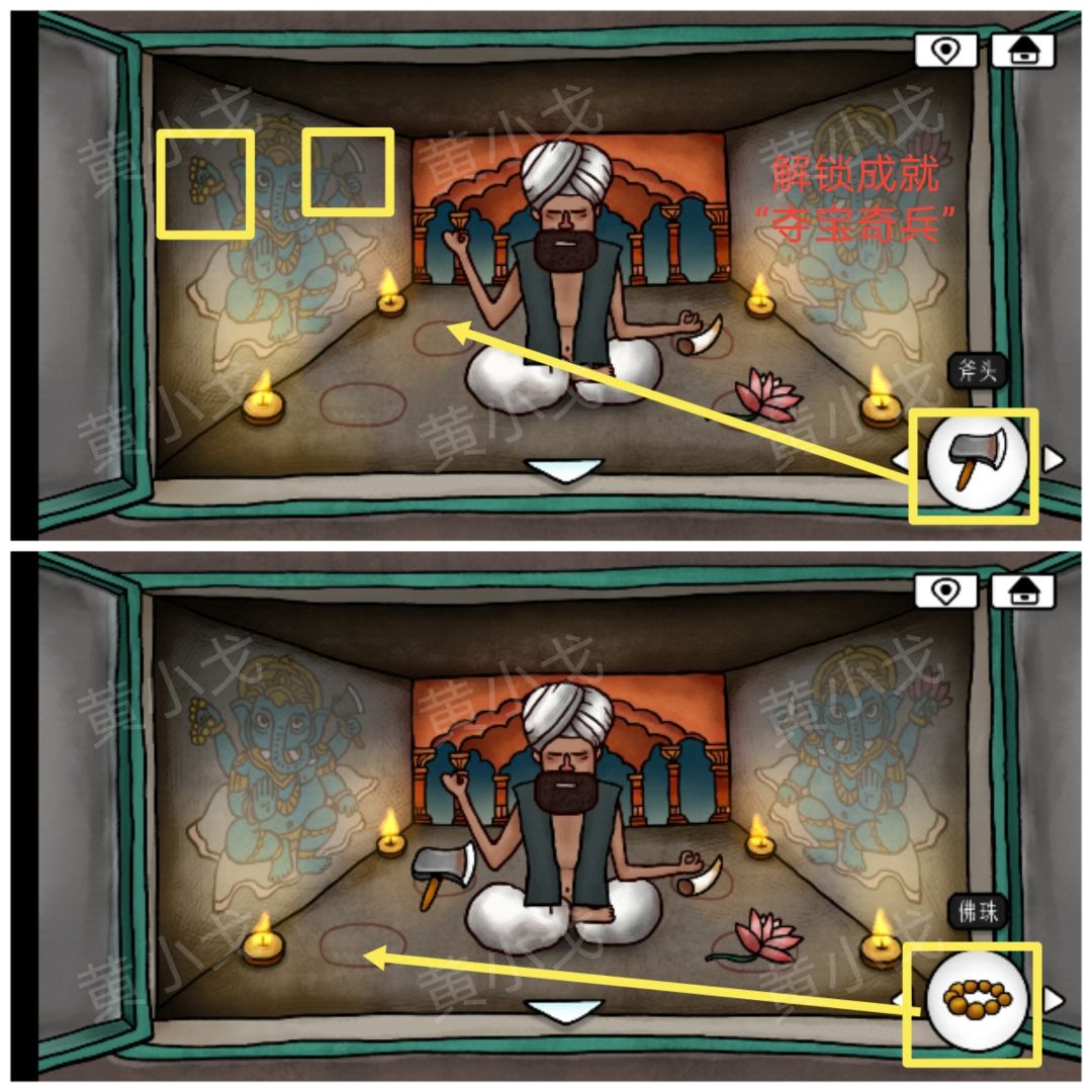 20.根据壁画上对应物品的位置,把【象牙】、【莲花】、【斧头】和【佛珠】放到正确的位置上