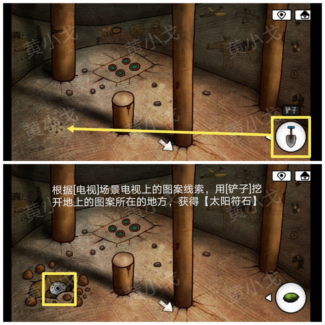 8.根据[电视]场景电视上的图案线索,用【铲子】挖开地上的图案所在的地方,获得【太阳符石】