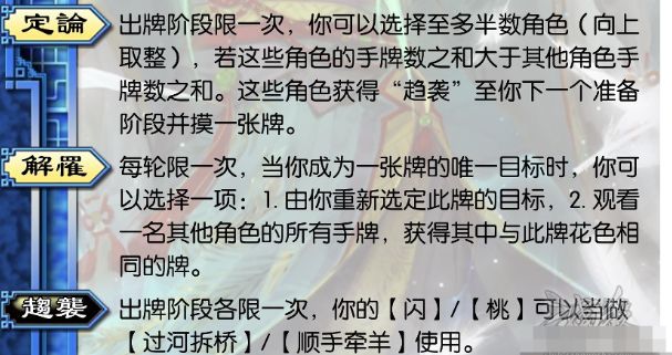 机制:此技能由【定论】赋予。获得该技能的角色可以在出牌阶段将【闪】当【过河拆桥】、将【桃】当【顺手牵羊】使用(每回合各限一次)。