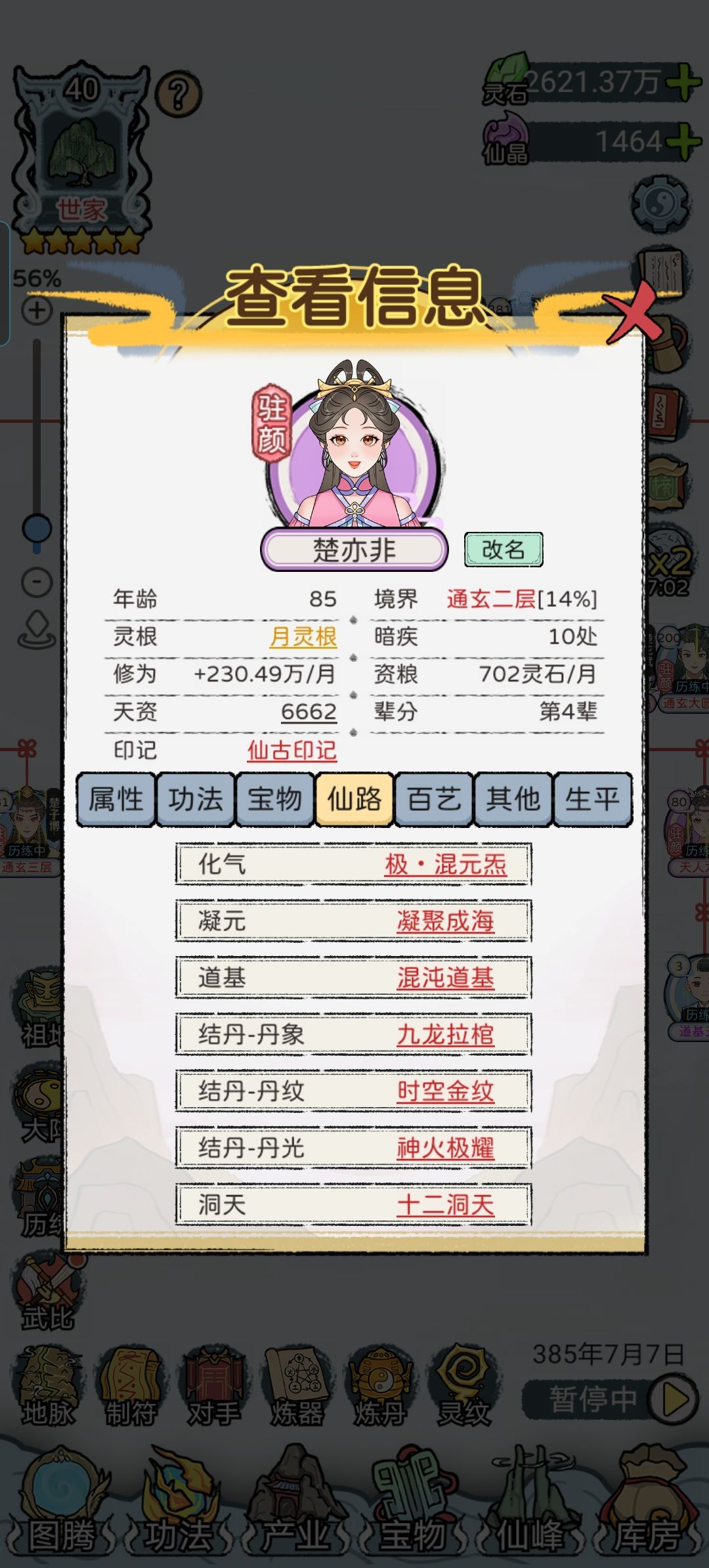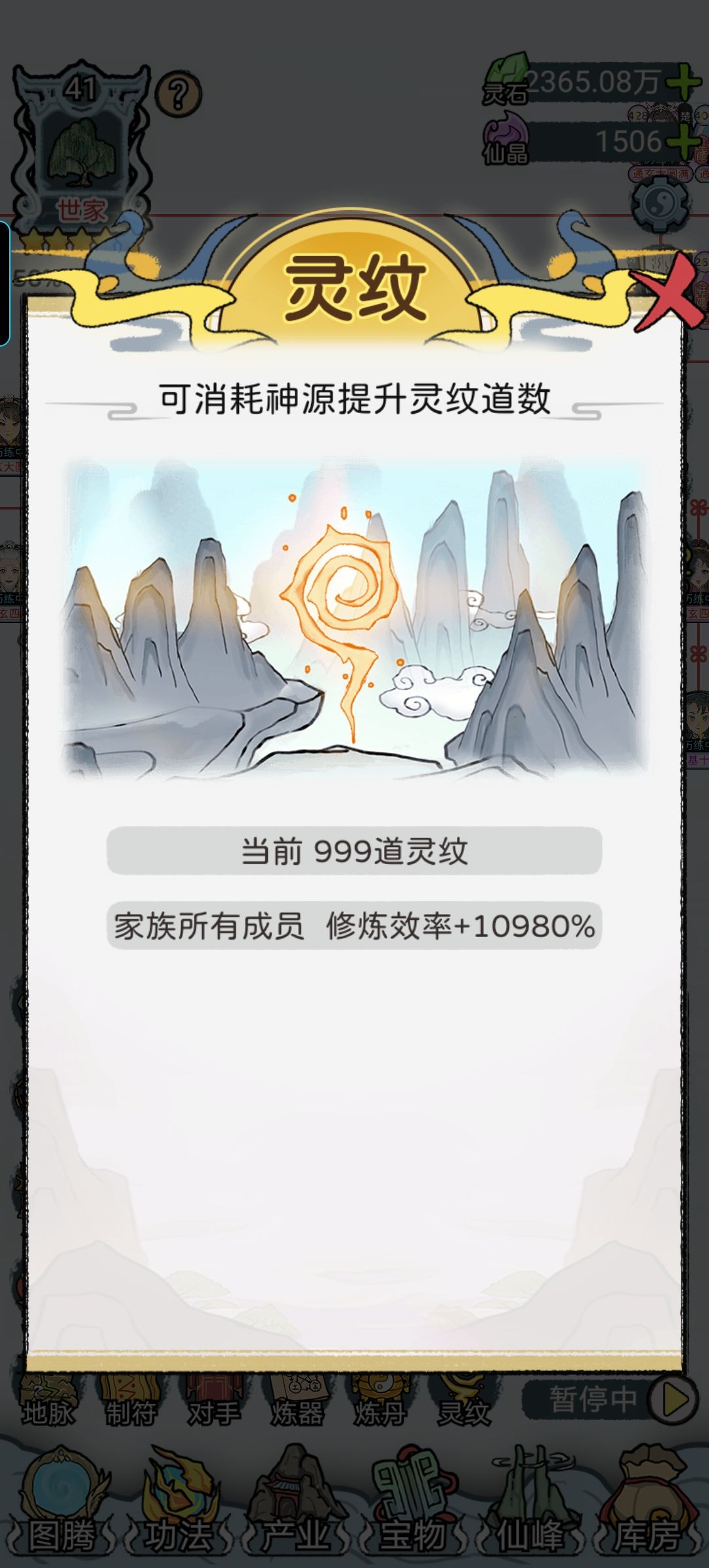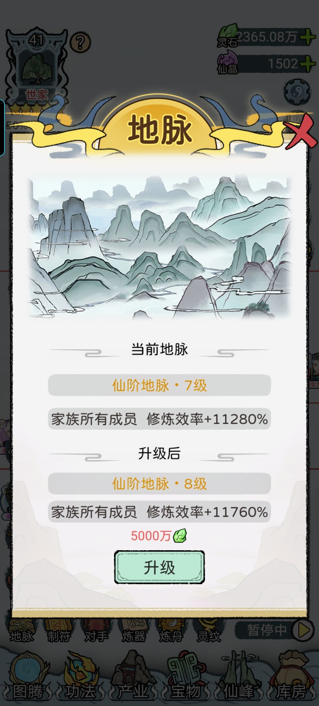 【灵石】是最缺的,主要用于升级地脉,我没看广告玩了四百年才升到仙阶7(p4)但如果愿意看广告会轻松很多。灵石来源产业,收益增幅和家族人员数量及境界挂钩,这部分前期随便搞搞就行。