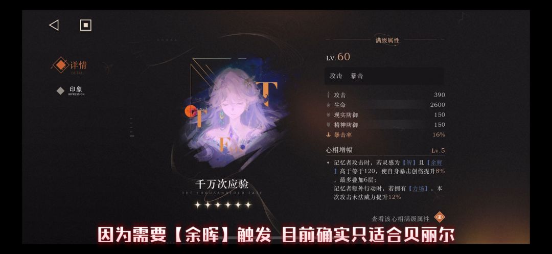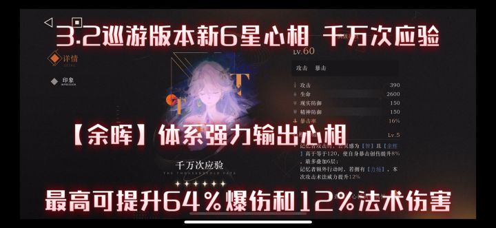 目前来看适合这个心相的只有巡游版本限定角色 贝丽尔 主要比较需要【余晖】所以还是蛮专的