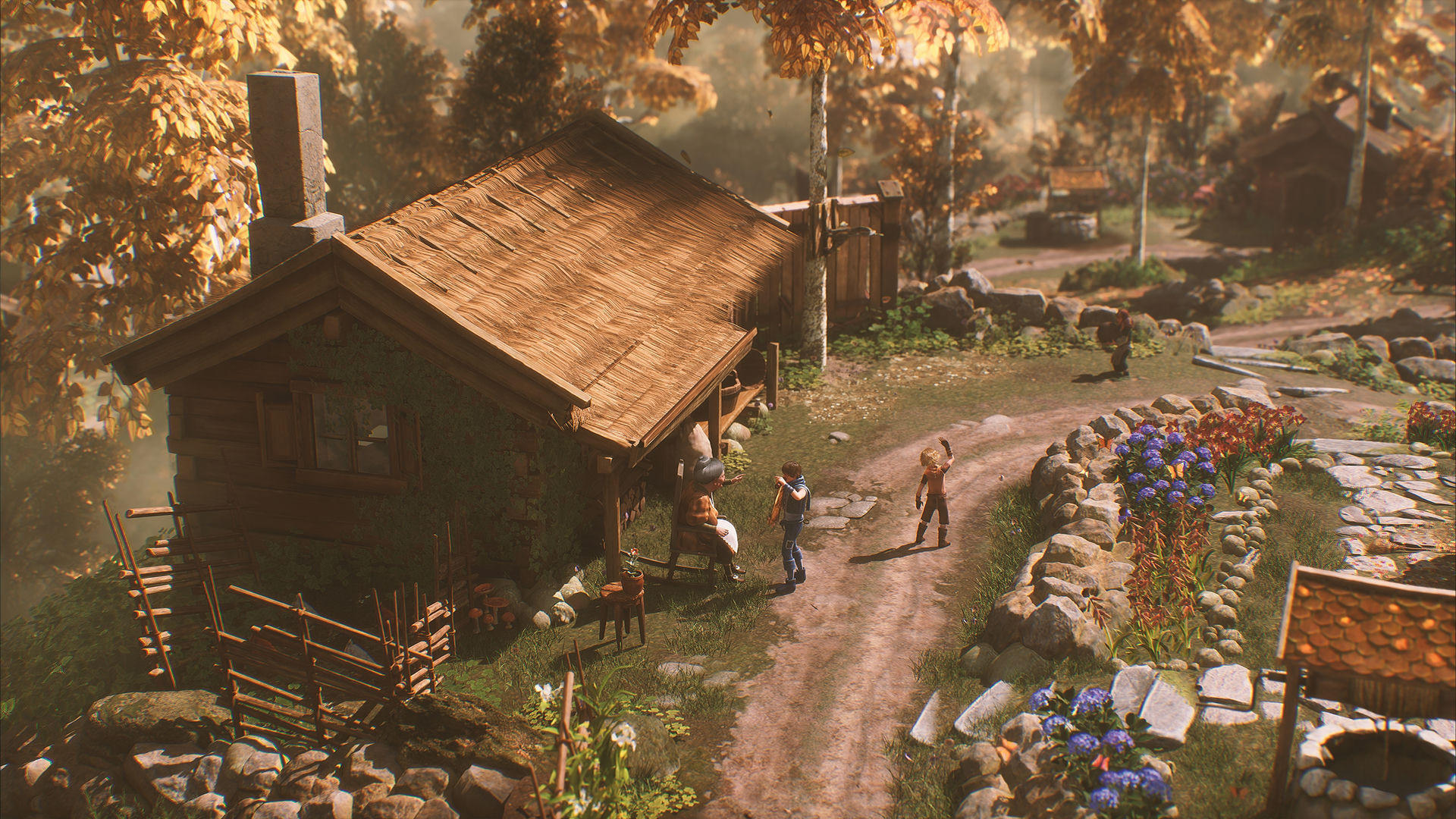 游戏最动人的地方,在于无需一句台词的细腻叙事。哥哥会主动背起害怕涉水的弟弟,在过独木桥时放慢脚步;弟弟则会捡起野花插在哥哥头上,趁其不备拍打村民的屁股再溜之大吉。这些藏在细节里的性格反差,让两个角色瞬间立体:哥哥的稳重不是沉闷,是默默守护的担当;弟弟的调皮不是顽劣,是困境中的生命力。你还能在沿途发现更多温暖彩蛋:让弟弟弹奏村口的管风琴,音乐家会投来赞许的目光;帮上吊者取回逝者遗物,他会卸下重担重新前行,这些隐藏成就让每一段探索都充满意义。