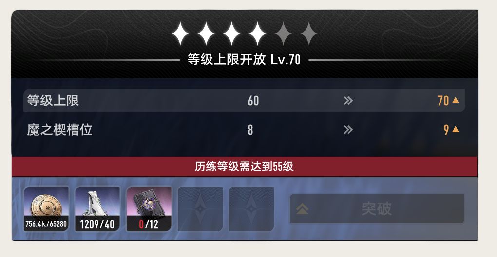 魔之楔槽位初始为4个,角色&近战武器&远程武器 每突破一次解锁1个槽位,这里需要注意的是角色至多会有9个槽位,而近战武器&远程武器至多有8个槽位,同律武器仅有4个槽位但无需解锁!