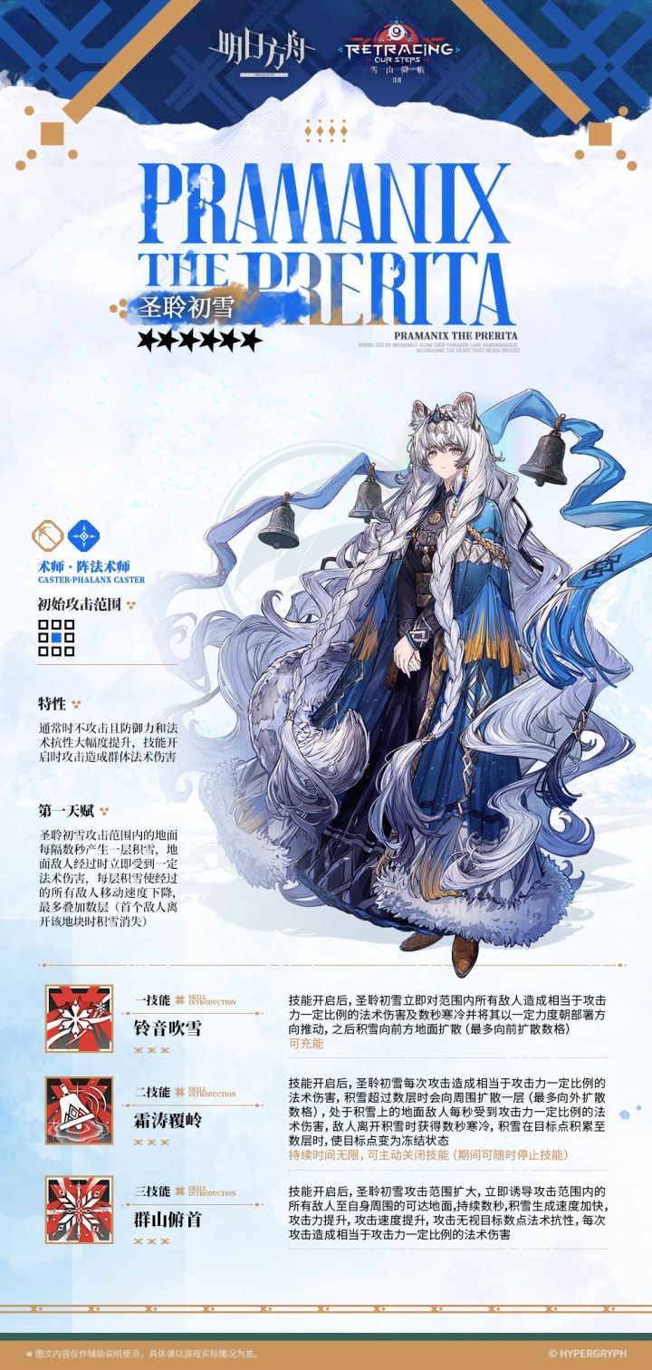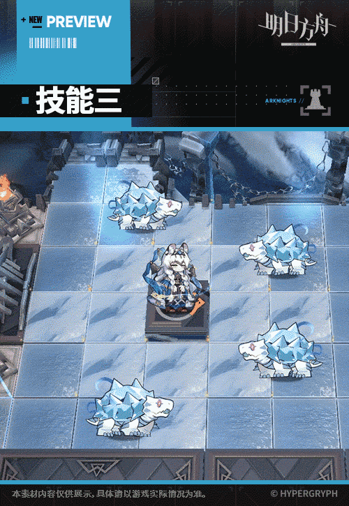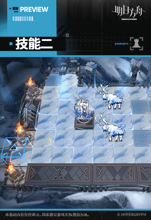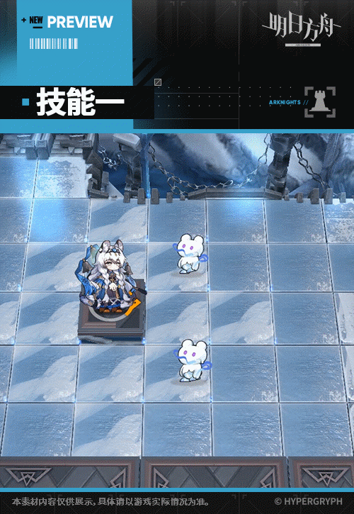 攻击范围内的地面会周期性产生一层积雪,地面敌人经过时立即受到相当于攻击力一定比例的法术伤害,每层积雪使经过的所有敌人移动速度降低,最多叠加数层(首个敌人离开该地块时积雪消失)