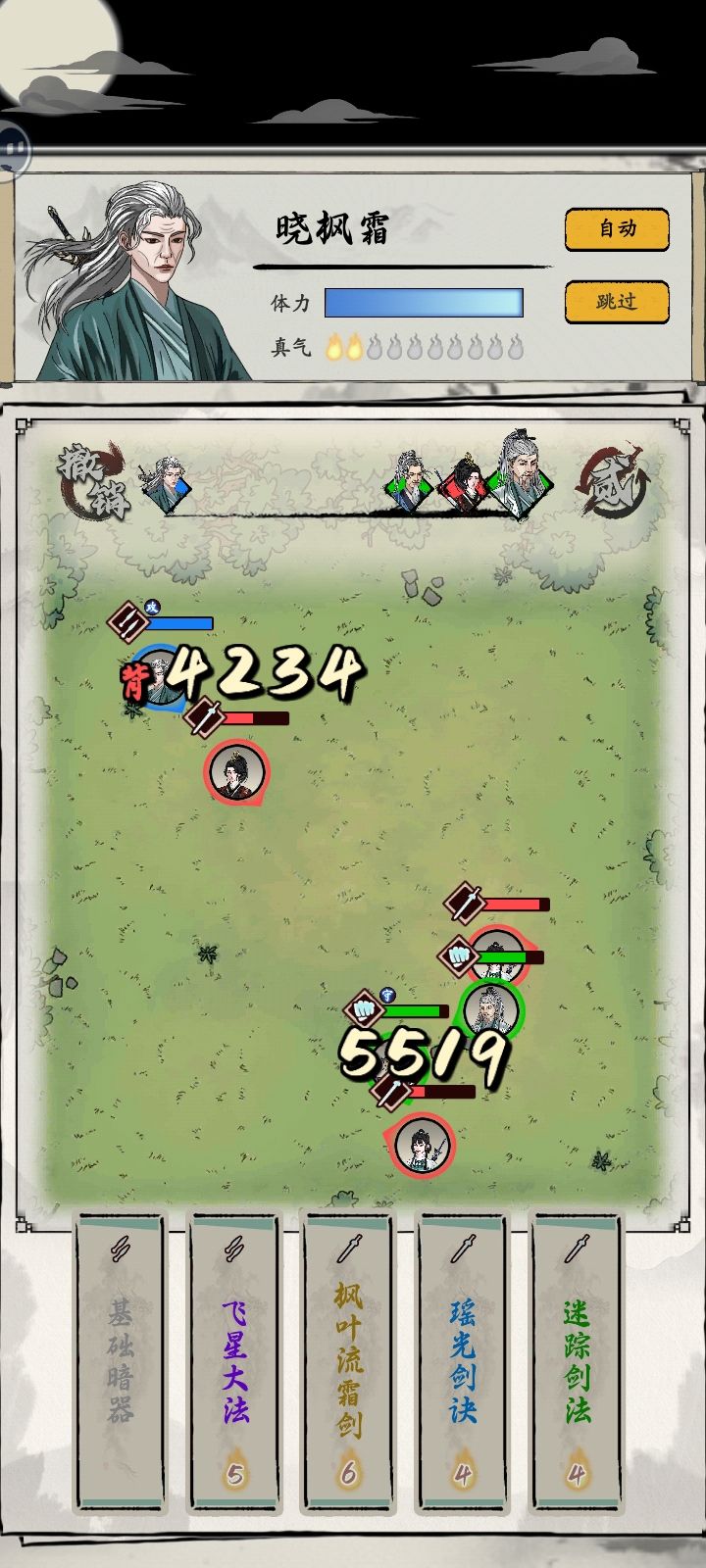 手动思路:先用摇光剑诀试探一下,使用后增加回蓝速度(这两个buff加起来回蓝也很慢),然后自创武功,最后切换远程跑后面背刺飞星大法。