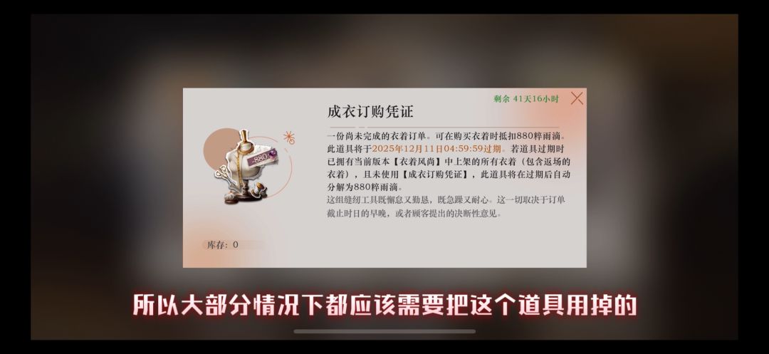 一份尚未完成的衣着订单。可在购买衣着时抵扣880粹雨滴此道具将于2025年12月11日04:59:59过期。若道具过期时已拥有当前版本【衣着风尚】中上架的所有衣着(包含返场的衣着)